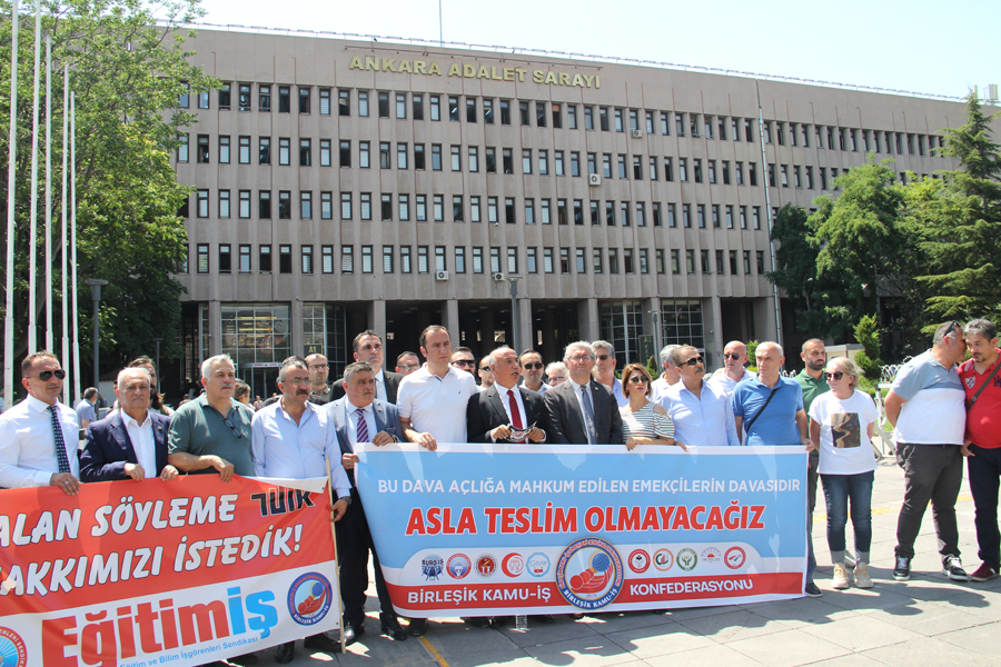 Ankara Adliyesi önünde Konfederasyonumuz Birleşik Kamu-İş Genel Mali Sekreteri Hasan Kütük, Eğitim-İş Genel Başkanı Kadem Özbay, Tüm Yerel-Sen Genel Başkanı ve MYK üyemiz Mücahit Dede, Ankara İl Başkanımız Doğan Dağdelen, Denizli İl Başkanımız Namık Kemal Aydoğan, bağlı sendikalarımızın MYK üyeleri, şube başkanları ve üyelerimiz bir araya geldiler.