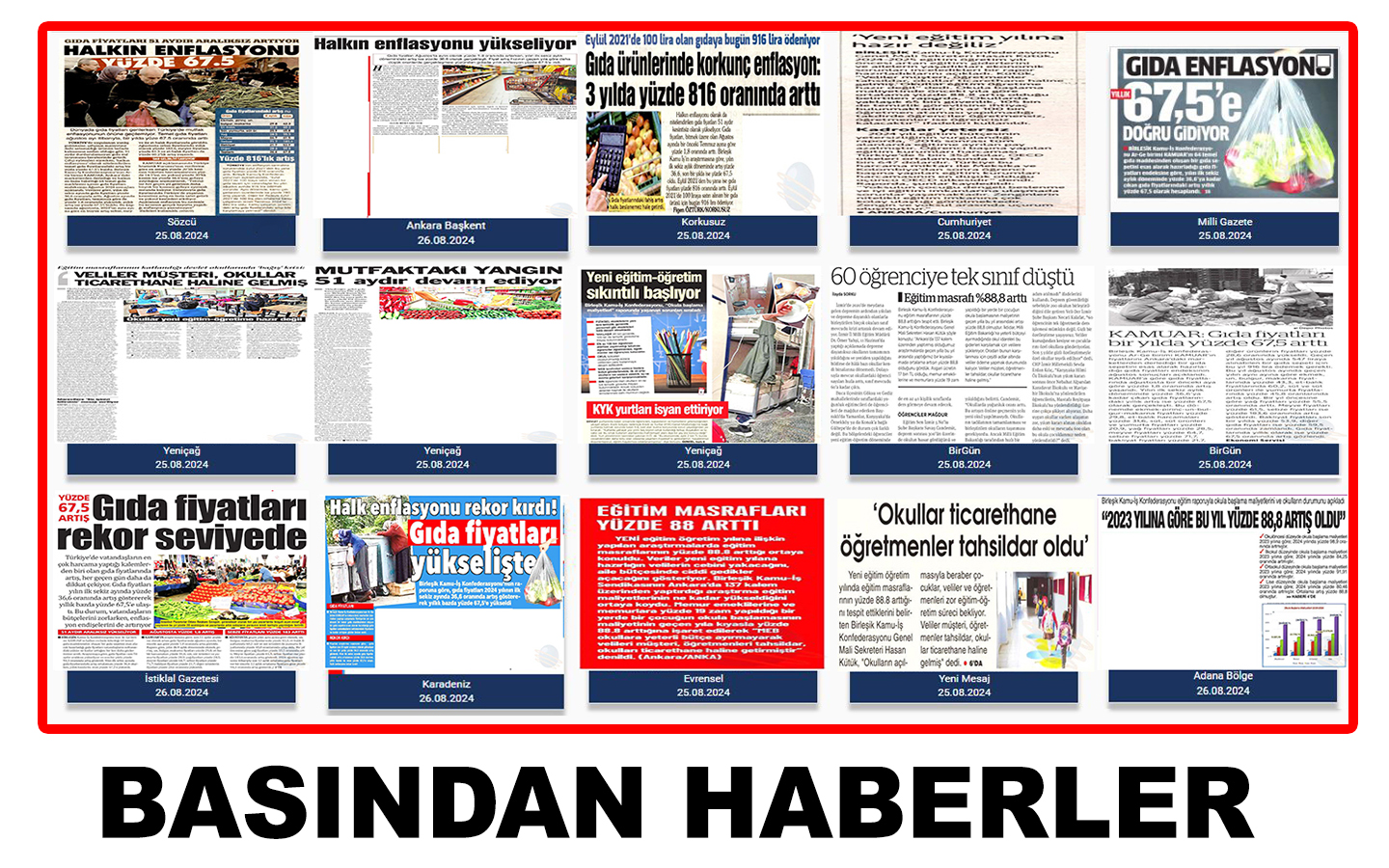 Konfederasyonumuz Birleşik Kamu-İş’in, Ağustos ayı halkın enflasyonu araştırması ile Eğitim Raporu çeşitli medya kuruluşlarında haberleştirildi.