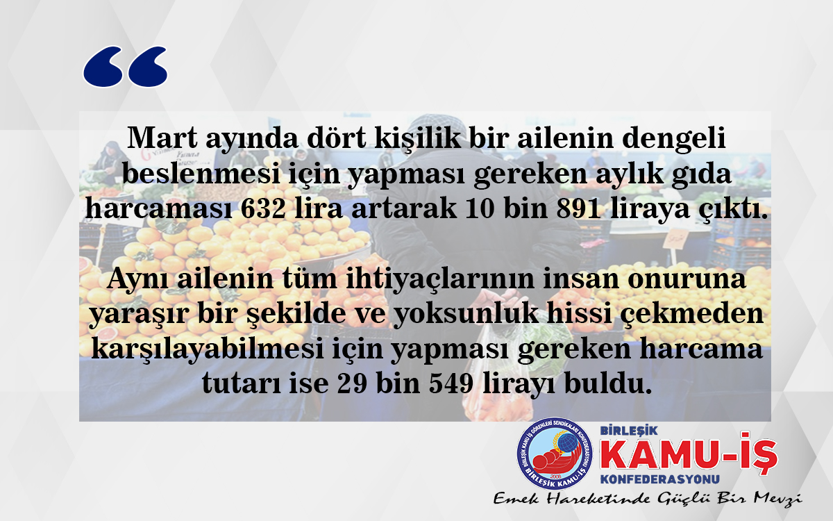 -Mart ayında dört kişilik bir ailenin dengeli beslenmesi için yapması gereken aylık gıda harcaması 632 lira artarak 10 bin 891 liraya çıktı.