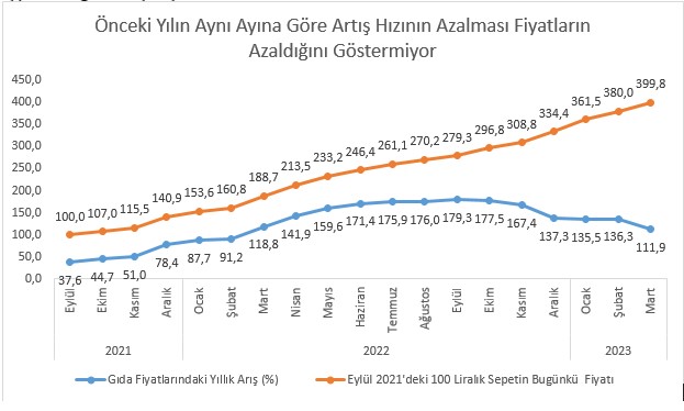 -TÜRKİYE’NİN İÇİNDE BULUNDUĞU YÜKSEK ENFLASYON SÜRECİNE GİRDİĞİ EYLÜL 2021’DE 100 LİRAYA SATIN ALINAN BİR GIDA SEPETİ İÇİN BU YIL MART AYINDA 400 LİRA ÖDEMEK GEREKTİ.