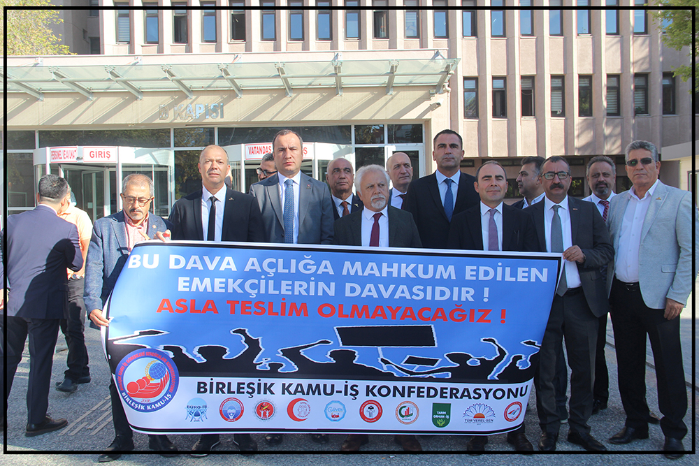 Konfederasyonumuz Birleşik Kamu-İş Genel Başkanı Mehmet Yeşildağ, Genel Sekreterimiz Özgür Aras, Genel Mali Sekreterimiz Hasan Kütük, Genel Örgütlenme Sekreterimiz Şükrü Balun, Konfederasyonumuz önceki Dönem Genel Başkanı Mehmet Balık, Genel Özlük-Hukuk ve TİS Sekreteri Mehmet Koç, Eğitim-İş Genel Başkanı Kadem Özbay, Tüm Yerel-Sen Genel Başkanı Mücahit Dede, Büro-İş Genel Başkanı Alay Hamzaçebi, Genel Sağlık-İş Genel Sekreteri Gazi Çeliker, bağlı sendikaların MYK üyeleri, şube başkanları ve üyelerimiz dava duruşması öncesinde bir araya gelerek Ankara Adliyesi önünde basın açıklaması yaptılar.