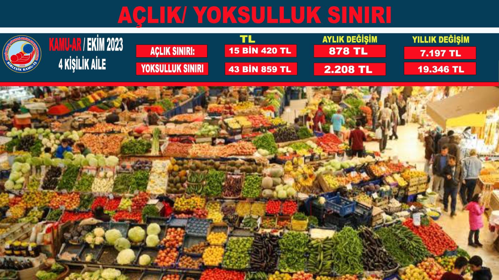 Birleşik Kamu-İş Konfederasyonu, Ar-Ge birimi KAMU-AR’ın, dört kişilik bir ailenin, dengeli ve sağlıklı beslenebilmesi için tüketmesi gereken gıda ile beslenmenin yanı sıra diğer ihtiyaçlarını da insan onuruna yaraşır bir şekilde yoksunluk hissi çekmeden karşılayabilmesi için yapması gereken harcamaları dikkate alarak hesapladığı açlık-yoksulluk sınırı araştırmasının Ekim 2023 sonuçları açıklandı.