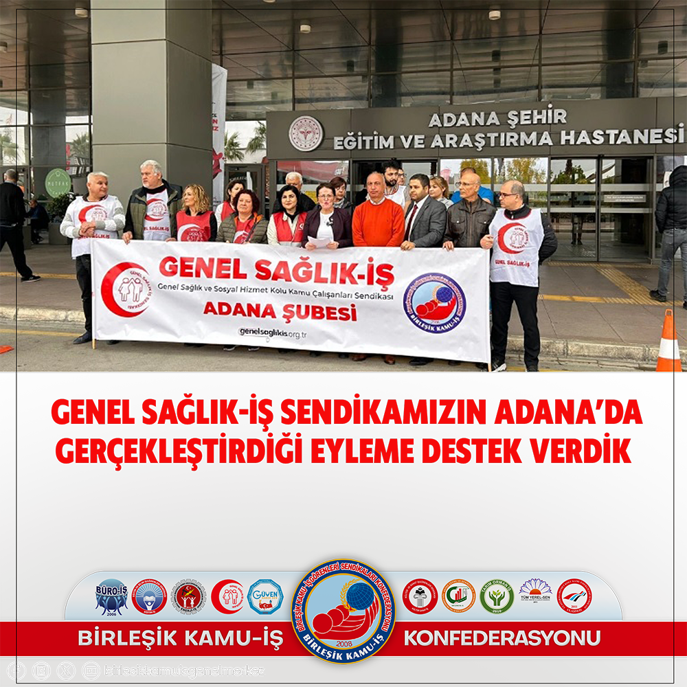 Konfederasyonumuz Birleşik Kamu-İş, Genel Sağlık-İş sendikamızın Adana Şehir Hastanesi önündeki eylemine destek verdi.