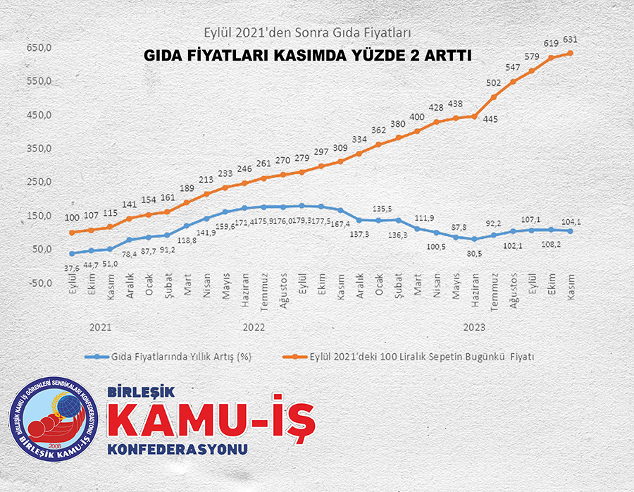Birleşik Kamu-İş Konfederasyonunun Ar-Ge birimi KAMUAR, fiyatlarını Ankara’daki marketlerden düzenli olarak derlediği ve halkın en fazla tükettiği 64 temel gıda maddesinden oluşan bir sepeti esas alarak hazırladığı gıda fiyatları endeksinin Kasım 2023 sonuçlarını açıkladı.