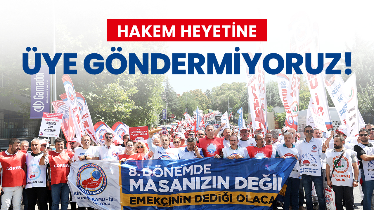 Konfederasyonumuz, üyelerinin 6’sı doğrudan, 1’i dolaylı olarak Cumhurbaşkanı tarafından belirlenen 11 kişilik Hakem Heyeti’ne üye göndermeme kararı almıştır. Çünkü bu heyetten, siyasi iktidarın belirlediği çoğunluk yapısı nedeniyle, masaya konan tekliften farklı ve kamu emekçilerinin lehine bir karar çıkmayacağı açıktır.