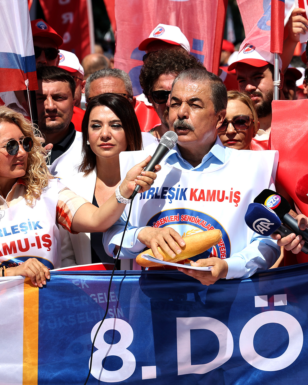 "Bugün üzerimizde ceketimiz değil, sendikacı önlüğümüz varsa; bugün işyerlerimizde değil, meydanlardaysak bilinsin ki emek ve haysiyet mücadelesi verdiğimiz içindir.