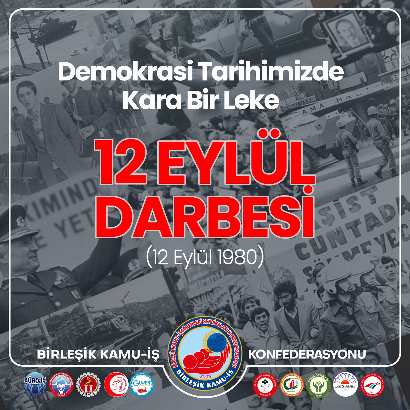 Birleşik Kamu-İş Konfederasyonu olarak; 12 Eylül’ün karanlık yıldönümünde hukuk devleti ilkelerini askıya alan ve korku iklimi yaratarak toplumu sindirmeyi amaçlayan tüm darbelere ve darbe girişimlerine karşı demokratik, laik hukuk devleti ile insan hak ve özgürlüklerini sonuna kadar savunacağımızı belirtiyoruz.