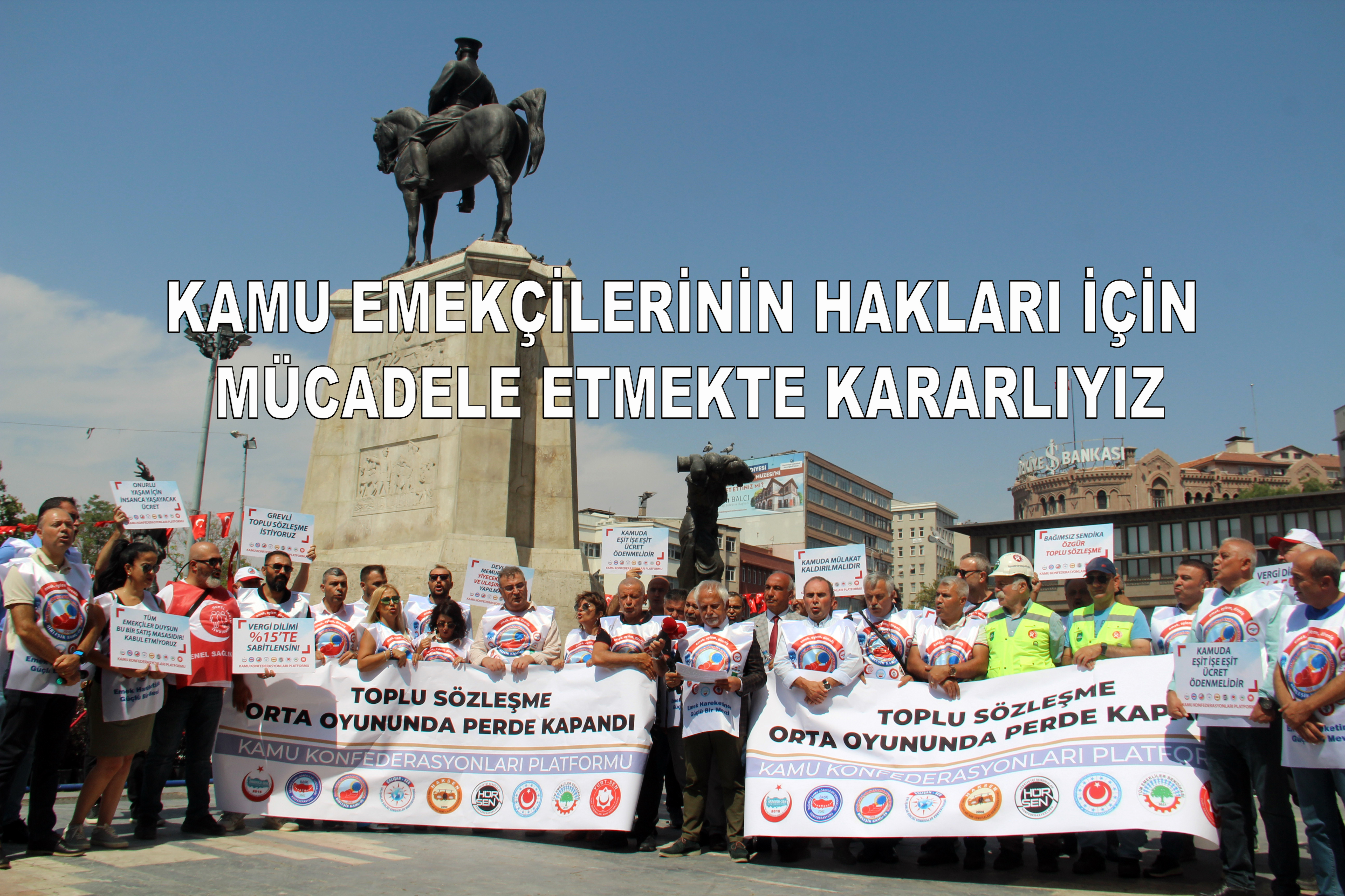 Ankara Ulus’ta bulunan Atatürk Heykeli önünde bir araya gelen Kamu Konfederasyonları Platformu üyeleri, “Toplu Sözleşme Orta Oyununda Perde Kapandı” pankartı arkasında “Açlık-Yoksulluk Kader Değildir”, “Ücretli Köle Olmayacağız”, “Güvenceli İş İnsanca Yaşam İstiyoruz”, “Susma, Sustukça Sıra Sana Gelecek”, “İnsanca yaşamak istiyoruz” sloganları atarak Hakem Kurulu’nun onayladığı zamlara tepki gösterdiler.