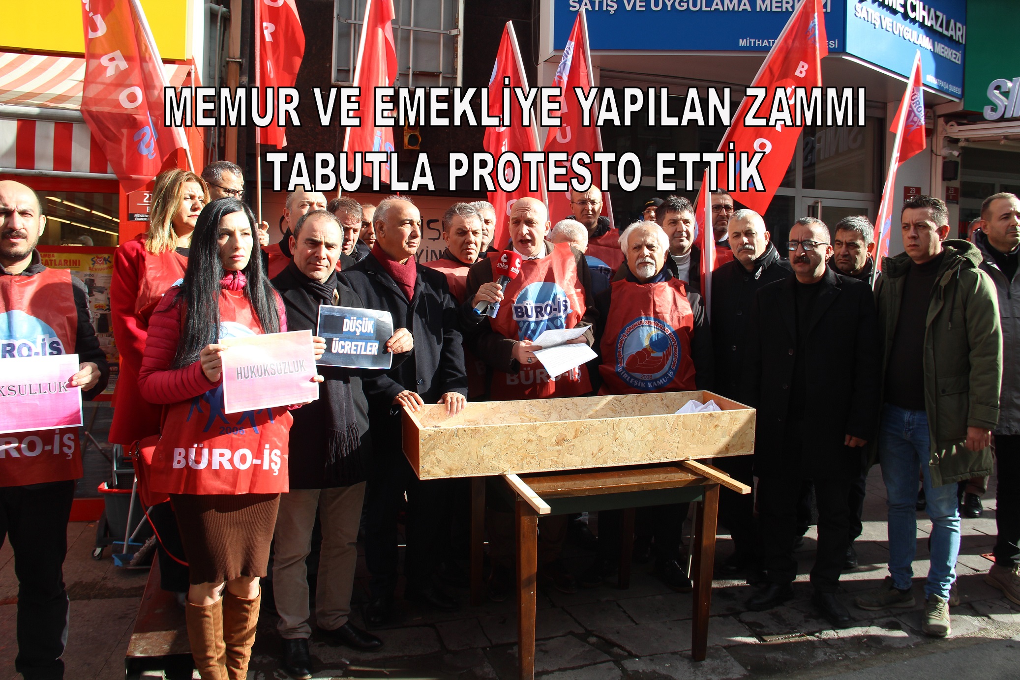 Konfederasyonumuza bağlı Büro-İş Sendikamızın memur ve emekliye yapılan zammı protesto eylemine destek verdik. Büro-İş üyeleri, tabut taşıyarak düşük ücretler, yoksulluk ve açlık gibi sorunlara dikkat çekti.