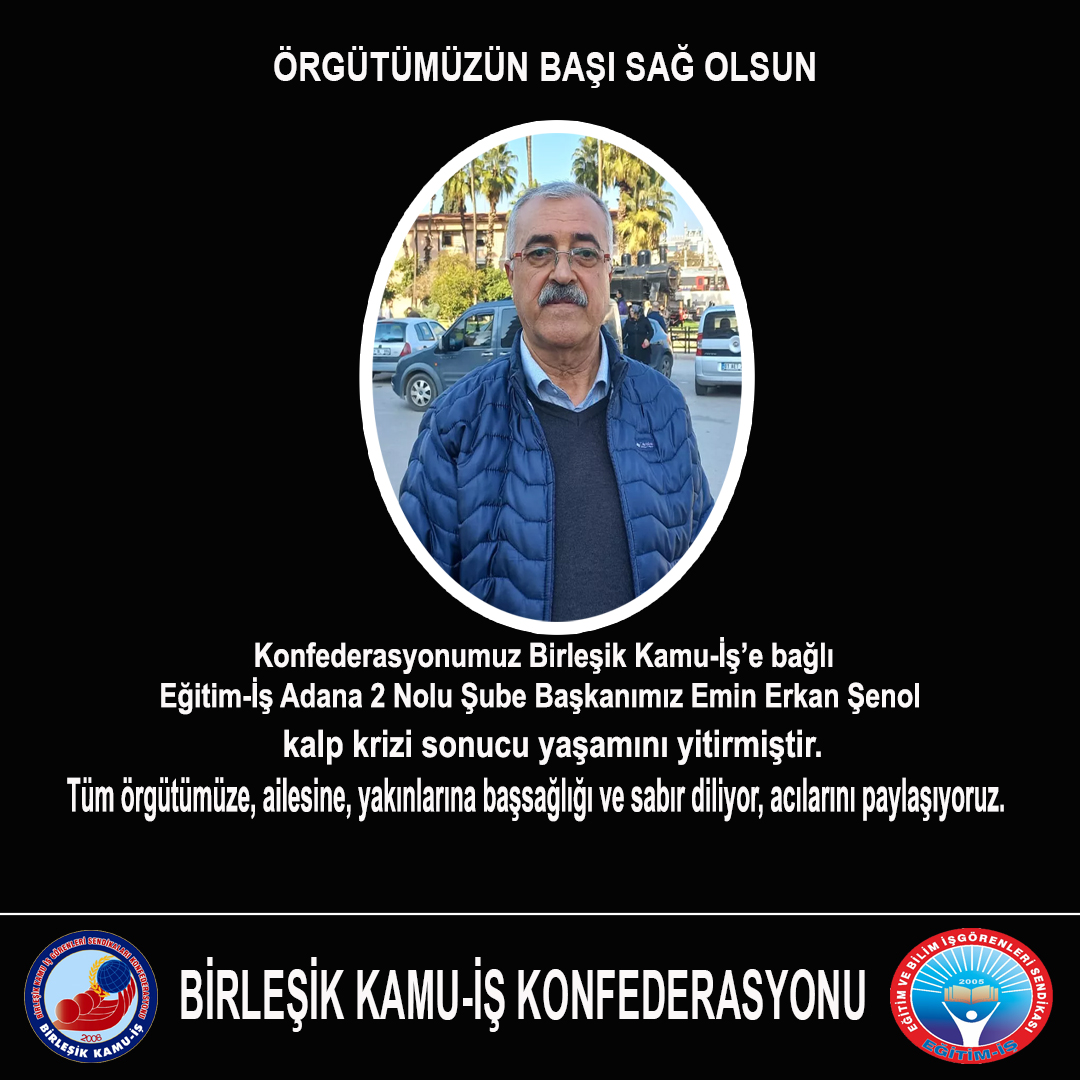 Konfederasyonumuz Birleşik Kamu-İş’e bağlı Eğitim-İş Adana 2 Nolu Şube Başkanımız Emin Erkan Şenol kalp krizi sonucu yaşamını yitirmiştir.