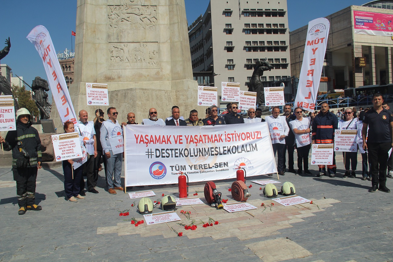 “Yaşamak ve Yaşatmak İstiyoruz! pankartı ile “#Destekolunmeslekolalım” hashtag ile destek isteyen Tüm Yerel-Sen üyeleri, “İtfaiye Memuru Köle Değildir.”, “Susma Haykır İtfaiye Meslektir.”, “Yaşamak ve Yaşatmak İstiyoruz.” sloganları attı.