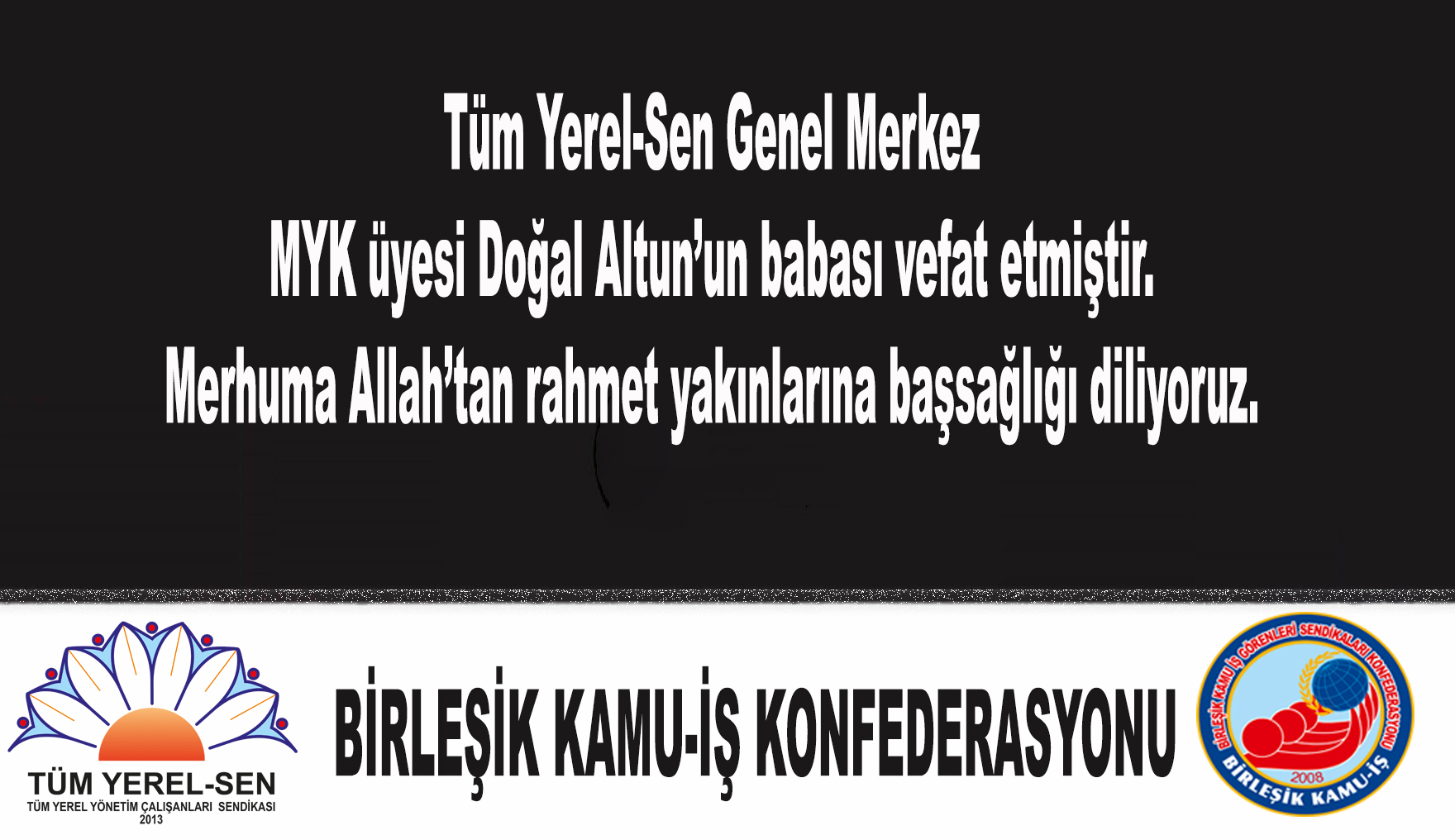 Konfederasyonumuz önceki MYK üyesi ve Tüm Yerel Sen Genel Merkez MYK üyesi Doğan Altun'un babası vefat etmiştir. Merhuma Allah'tan rahmet yakınlarına başsağlığı diliyoruz.