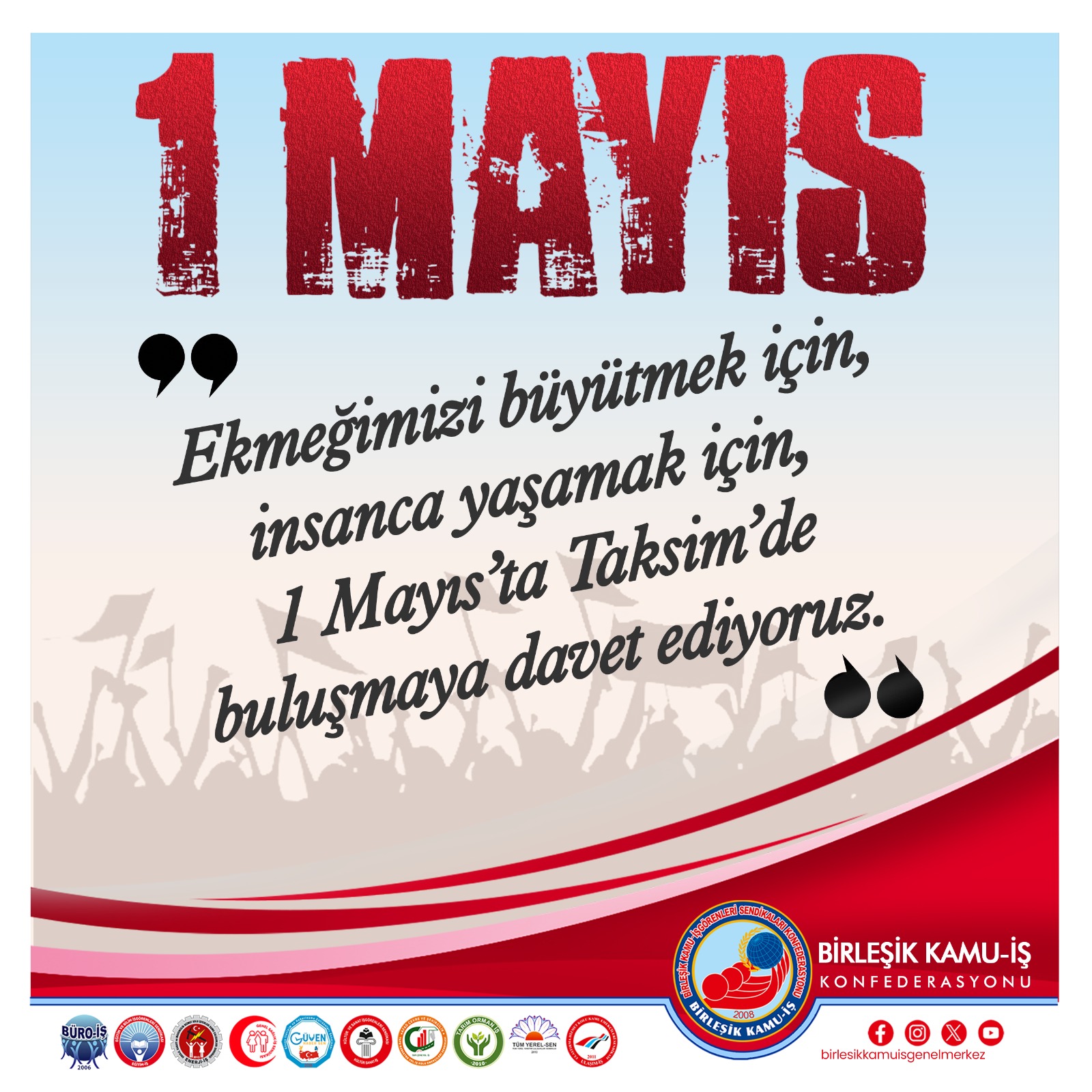 İşimiz, ekmeğimiz, alın terimiz, ülkemiz için, insanca bir yaşam, demokratik, Tam Bağımsız bir Türkiye için 1 Mayıs’ta Taksim Meydanı’ndayız!