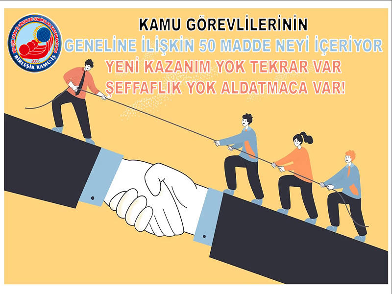 Memur-Sen Genel Başkanı’nın “Hizmet kollarında 291, kamu görevlilerinin geneline ilişkin de 50 olmak üzere toplam kazanım elde ettik” diyerek kestirip atmasının altında yatan gerçeği deşifre etmek, kamu emekçisinin haklarının gerçek savunucu Birleşik Kamu-İş Konfederasyonu olarak bizim görevimizdir.